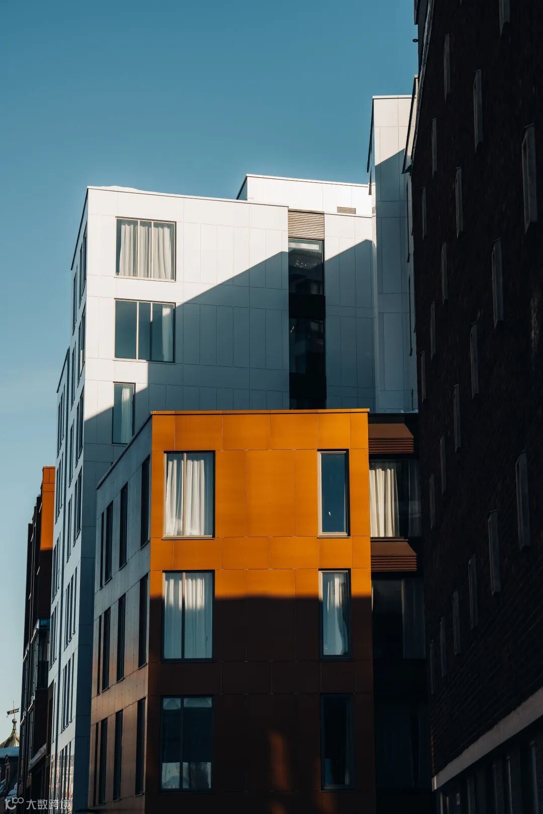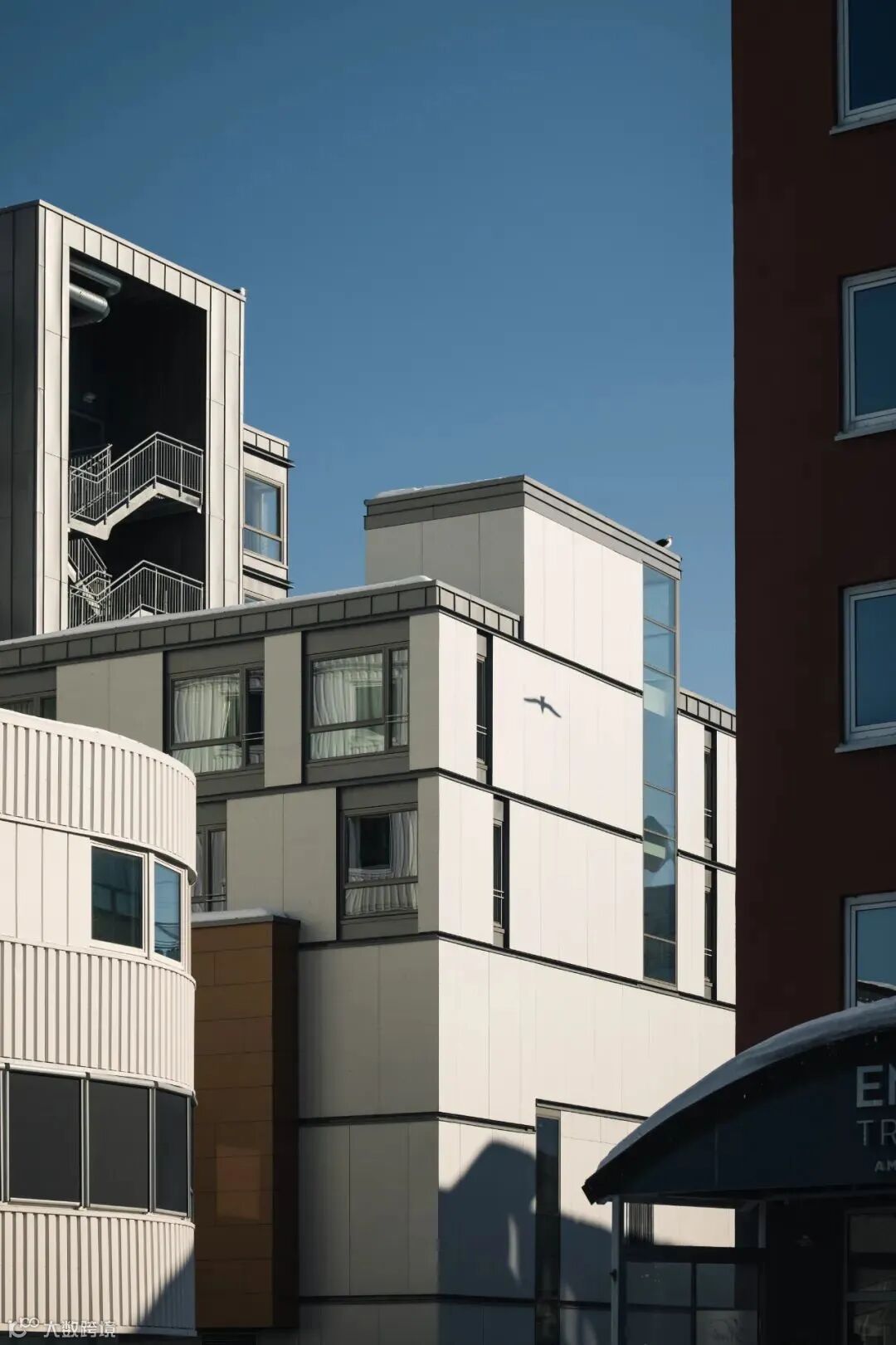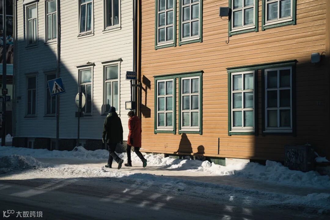 地处高纬度地区的特罗姆瑟,整个白天太阳都不会升的很高,加上城市街道相对狭窄,房屋间距较近,这就意味着特罗姆瑟的街头彩色建筑长长的投影会形成各种各样强烈的光影对比与色彩对比。这是人文扫街中非常喜欢捕捉的画面。