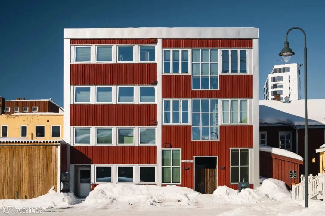 比如下图中的特罗姆瑟海洋馆,建筑造型创意是一排倒下的多米诺骨牌,而房顶还带着一些积雪。阳光照射下,蓝色、白色与层次感很强的光影线条交织在一起,异常迷人。