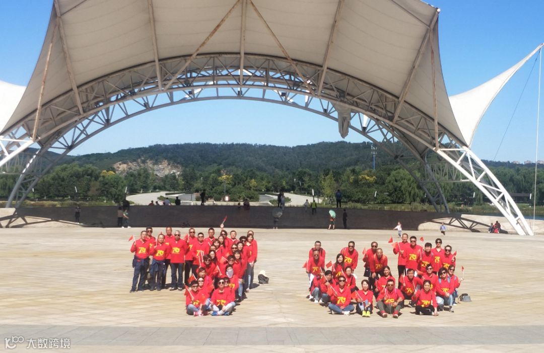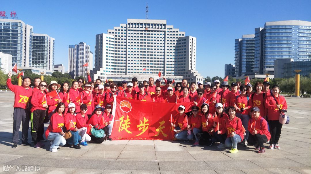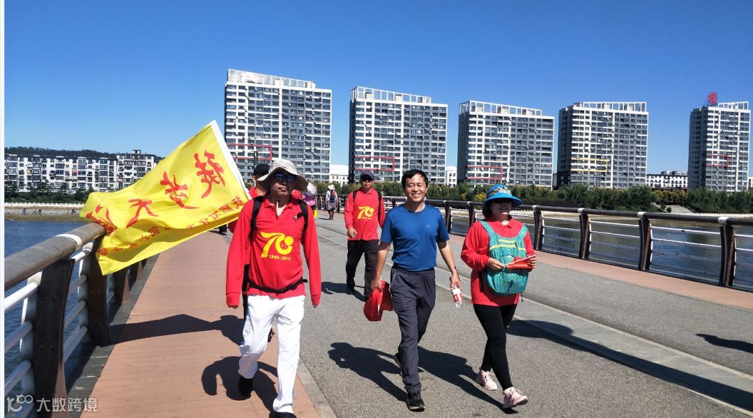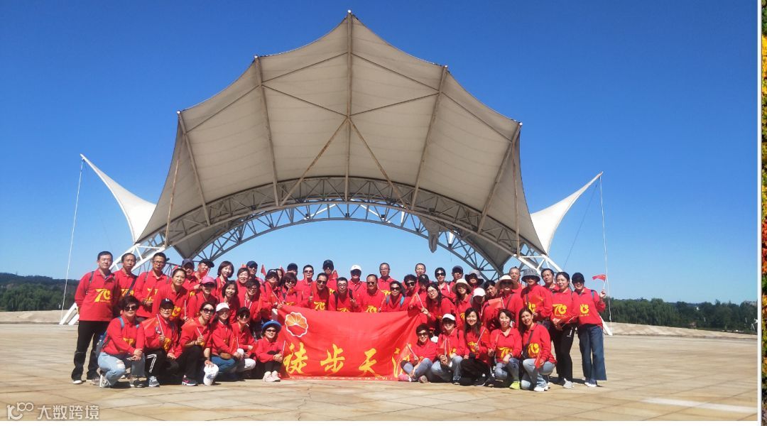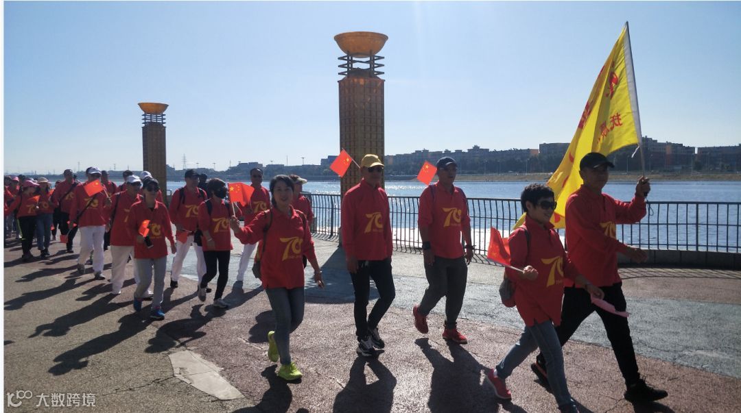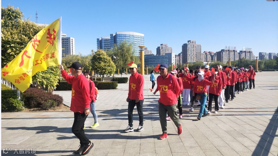 队员们在路途中齐喊爱国口号,充满了新时代的正能量。休憩之余,各类知识问答、小游戏穿插其中,在欢呼声中将活动推向一个又一个高潮。大家沿着滨河公园走行大约10公里,历经两个半小时到达月牙岛广场,队员排成“70”的队形合影留念,向祖国70华诞致敬。
