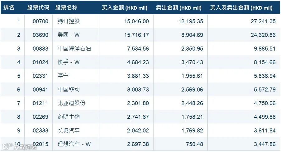成交活跃股票方面,港股通(沪)南下资金和港股通(深)南下资金前三大成交股均为腾讯控股(700)、美团-W(3690)和中国海洋石油(883)。