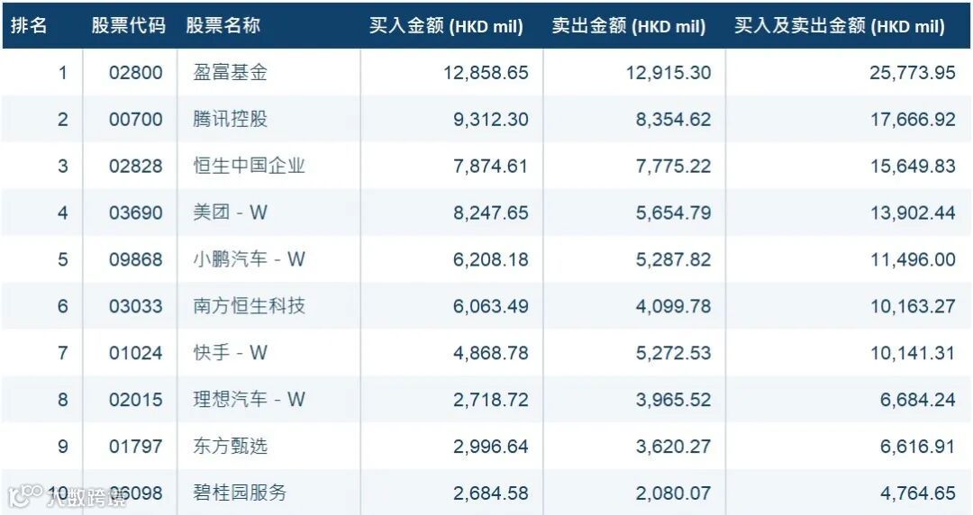港股通(沪)南下资金前三大成交股为腾讯控股(700) 、盈富基金(2800) 和美团-W (3690);而港股通(深)南下资金前三大成交为盈富基金(2800) 、腾讯控股(700) 、恒生中国企业(2828)。