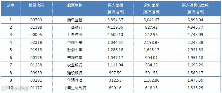 港股通(沪)十大成交活跃股