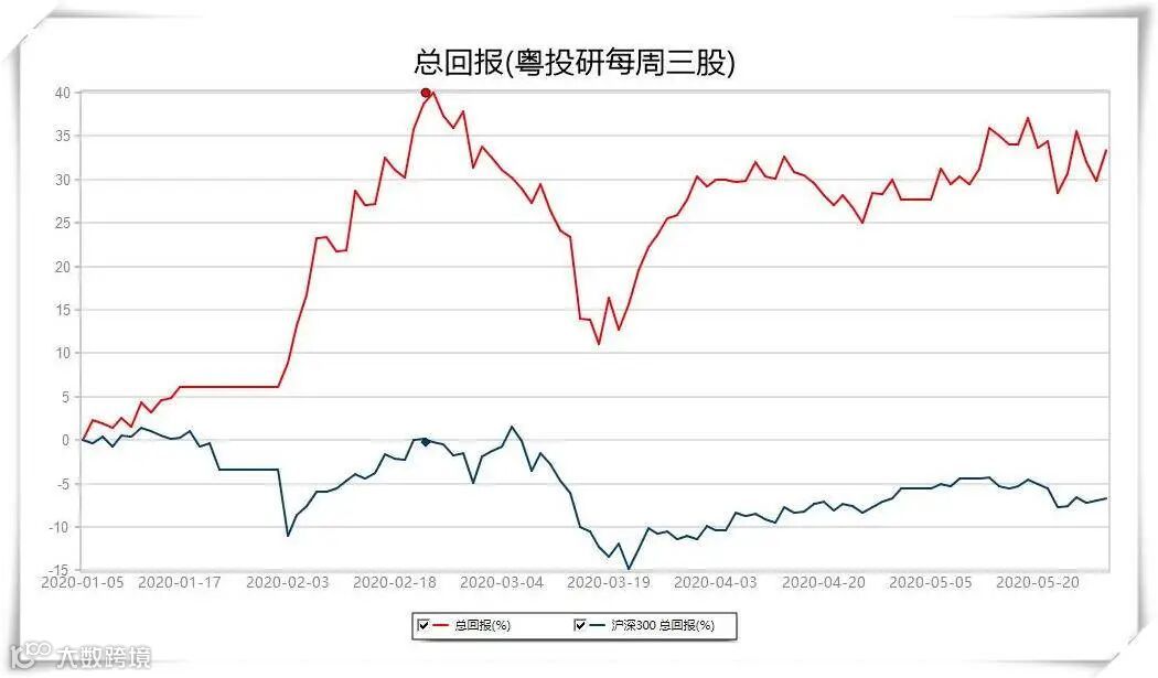 2020年1月5日-2020年5月29日,粤投研每周三股模拟组合累计上涨33.43%,同期沪深300指数下跌6.71%。模拟模拟组合计算方法:每周首个交易日开盘买入,最后一个交易日收盘卖出。数据来源:Wind。