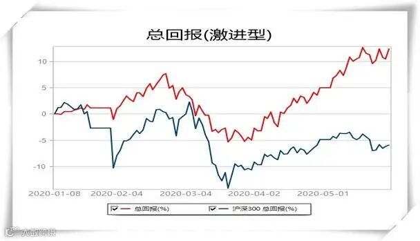 2020年1月9日-2020年5月29日,粤投研激进型基金组合累计上涨12.52%,同期沪深300指数下跌5.96%。数据来源:Wind。