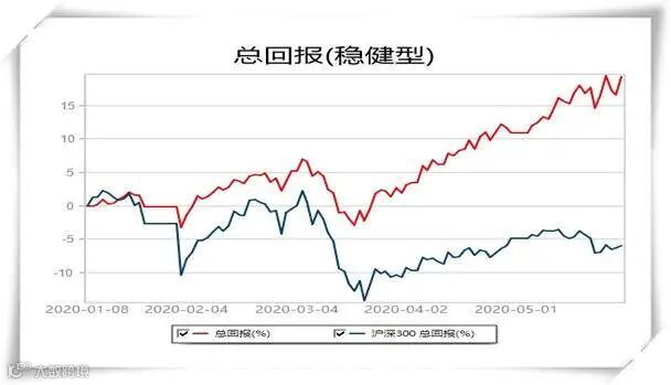 2020年1月9日-2020年5月29日,粤投研稳健型基金组合累计上涨19.38%,同期沪深300指数下跌5.96%。数据来源:Wind。