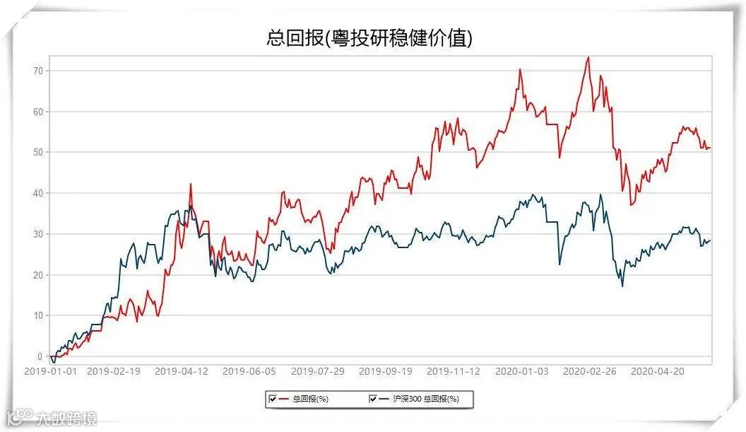 2019年1月1日-2020年5月29日,粤投研稳健价值模拟组合累计上涨51.20%,同期沪深300指数上涨28.44%。数据来源:Wind。