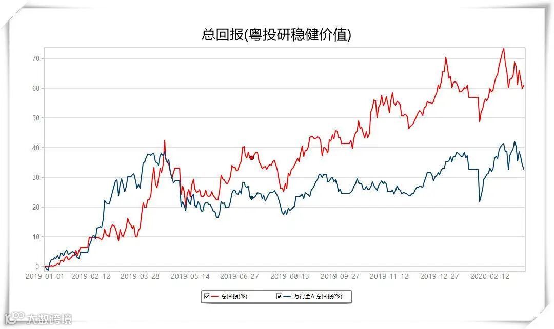 2019年1月1日-2020年3月13日,粤投研稳健价值模拟组合累计上涨61.04%,同期万得全A指数上涨32.7%。数据来源:Wind。