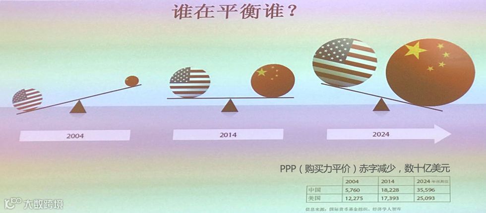 哈佛商学院的艾利森教授曾经在2017年制作了一张中美购买力平价长期对比图。从这个图可以看到,在2004年的时候美国是一个大球,2014年两国平衡,2024年,中国变成了大球,美国变成了小球。艾利森教授认为,长期来看,中国有一个很大的优势,那就是高效率。