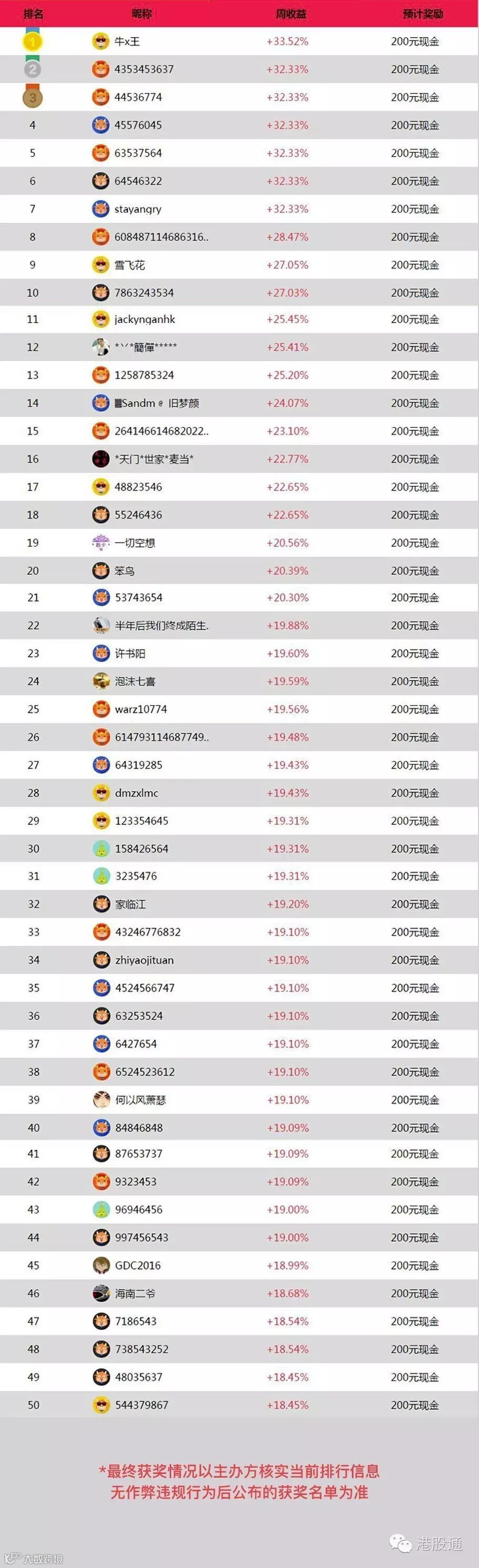 第二周收益排名前五十名的选手和模拟投资表现如下。每周排名前50的选手均将获得人民币200元的现金奖励。