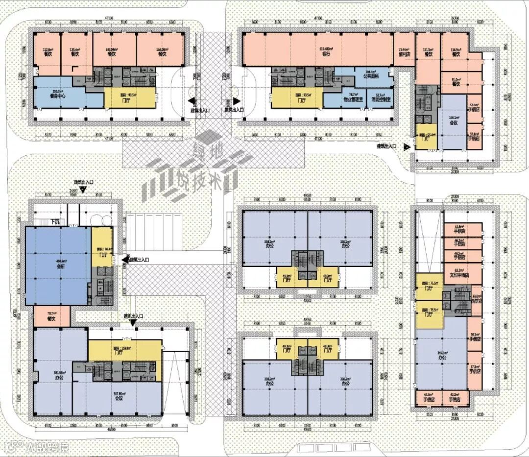在外观上,绿地IAC以金属铝板+玻璃+浅黄/灰色面砖等材质,整体打造的商务CBD质感。