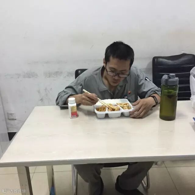 一盒厂里的五元盒饭,一瓶水就是他的午餐,虽然简单,但他却吃得津津有味。