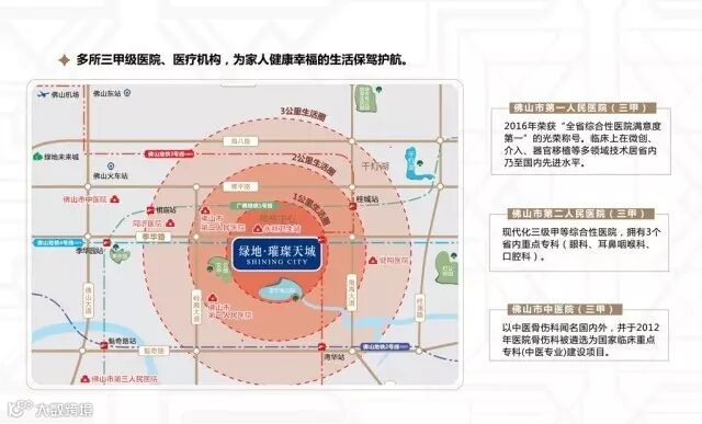教育和医疗是生活的两大永恒话题,孩子教育靠名校,家人健康靠医疗。项目周边环伺三所甲级医院,一所二甲级医院:项目西侧有三甲医院佛山市第一人民医院,项目北侧有三甲医院佛山市第二人民医院、佛山市中医院,以及周边知名度较大的同济医院(二甲)、永新卫生站、健翔医院等。