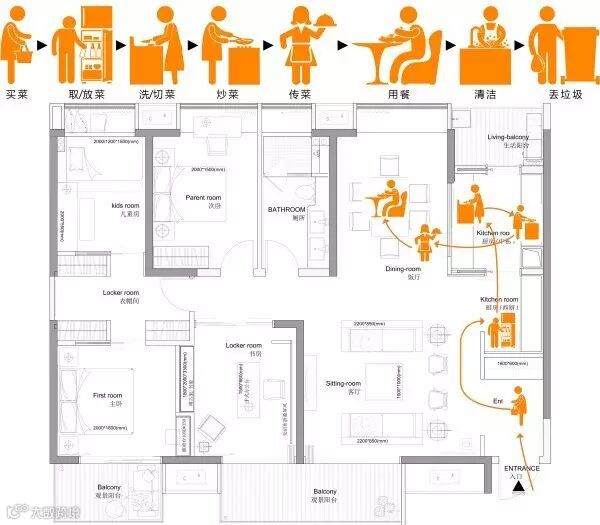 要想做到上图的短路线其实并不难,虽然每个人的生活习惯不同,每个房子的空间布局也有不同,但日常家务离不开的就是3座大山:烹饪、洗衣、打扫。规划家务路线一定要遵循以下2点。