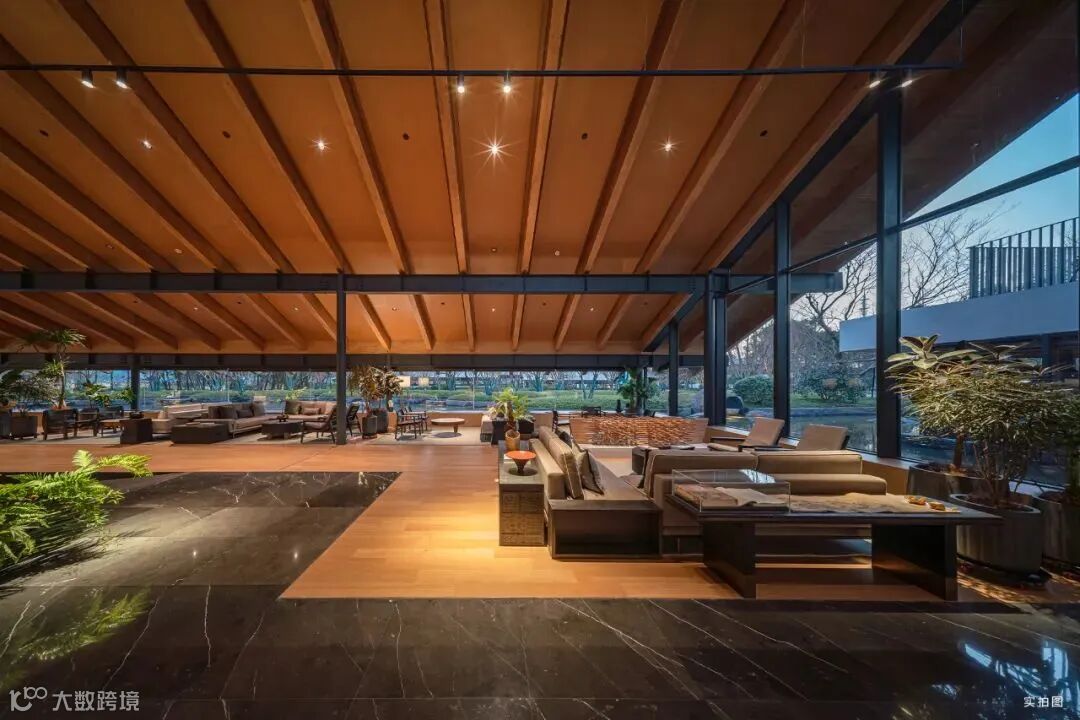 度假区有艺术气息浓郁的桃源世界艺术中心,赖特式大面积斜坡屋顶、全落地玻璃窗,约118米连续界面无缝与自然美景融合;步入室内,绿植、艺术品与简约原木家具构成一派宁静禅意的精神氛围,泡一壶手冲咖啡,在书吧里小坐,看阳光从树叶的缝隙中撒下光影,在这里,停下来感受世界,用好风景治愈心情。