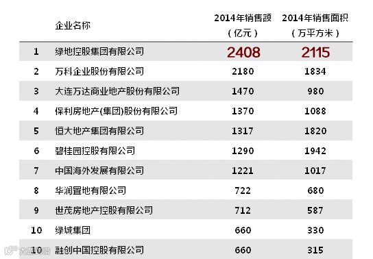 2014年中国房地产销售额前十企业榜