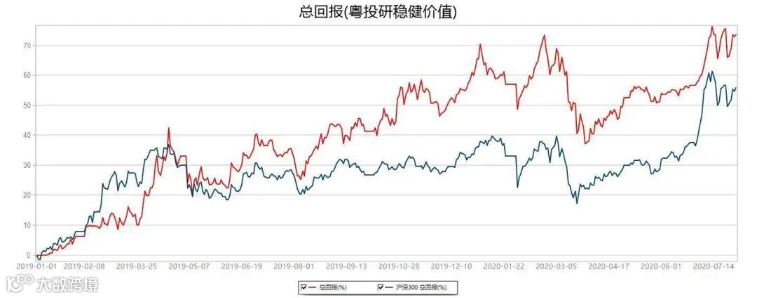 粤投研稳健价值模拟组合累计上涨73.44%,同期沪深300指数上涨55.95%。2019年1月1日-2020年7月31日,数据来源:Wind。