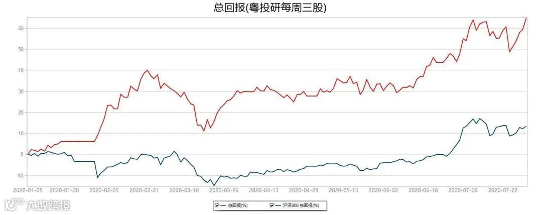 粤投研每周三股模拟组合累计上涨64.72%,同期沪深300指数上涨13.27%。模拟模拟组合计算方法:每周首个交易日开盘买入,最后一个交易日收盘卖出。2020年1月5日-2020年7月31日,数据来源:Wind。