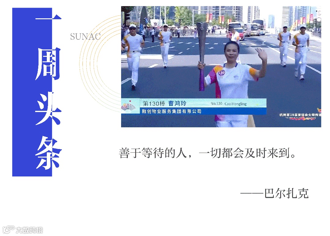 9月15日,杭州第19届亚运会火炬传递来到千年商港温州城。170名来自各行各业的优秀代表担任火炬手,在长度9.2公里的“薪火”路上,高擎亚运火种,向梦想奔跑。融创服务集团总裁曹鸿玲作为第130棒火炬手顺利完成火炬传递。