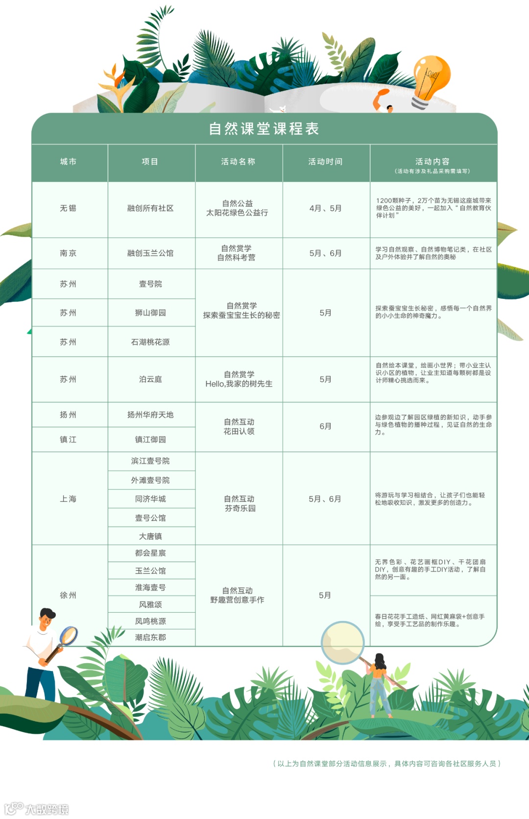 走出家门口,看见大世界!未来,融创上海区域各城市将陆续开办各类自然课堂活动,以四大板块形式与多种互动玩法,丰富业主的闲暇时光!想知道接下来具体有哪些好玩的课程内容吗?赶快戳下方「自然课堂」课程表,了解活动具体详情吧!