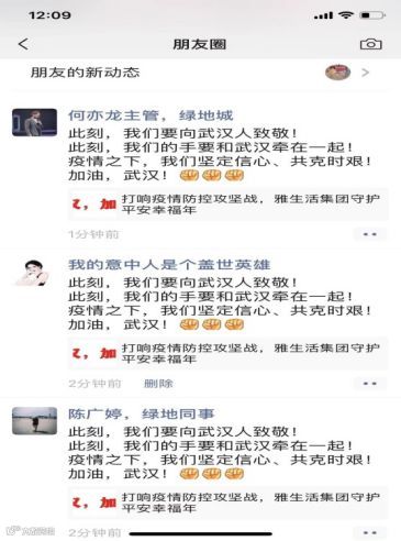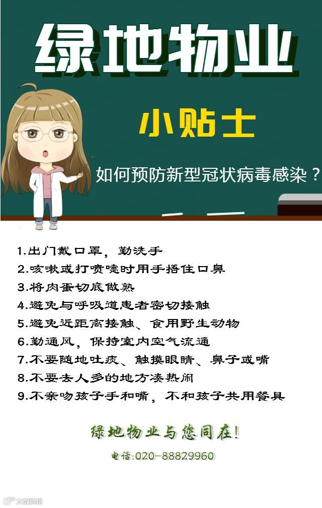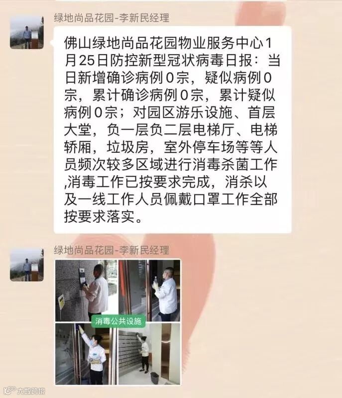 绿地广东各社区迅速采购红外测温仪、口罩、消毒液、消毒水等物资。同时,加强疫情告知,张贴温馨提示。在业主群及管家朋友圈进场防控疫情的相关宣传,增强业主及员工的防疫意识,每日在工作群内播报项目防疫最新信息。