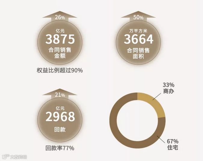 房地产主业稳健增长,发展质量持续提升。销售业绩平稳较快增长,抓开新盘、去库存、销大单、促回款等,全年累计实现合同销售金额3875亿元,同比增长26%;合同销售面积3664万平方米,同比增长50%;回款2968亿元,同比增长21.1%,回款率77%;9个区域事业部销售金额突破200亿元,其中3个突破300亿元,业绩贡献率24.5%。