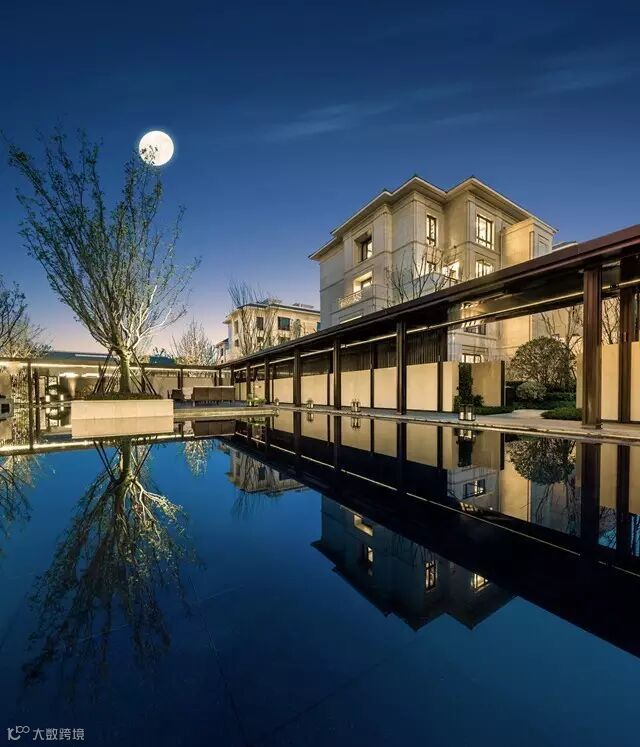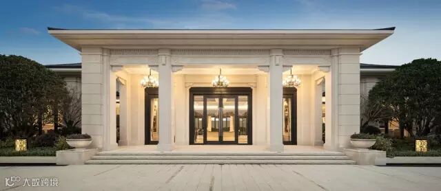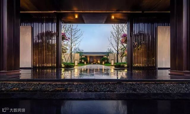 © 一迎丨门第之尊,中国最高等级的迎宾仪式:以形如古代官宦之家“牌楼”的指示,昭示门第之尊贵;以臻稀树种对仗的树阵、昂贵石材堆砌的水池、雕琢森严的门庭,共同构建最高等级的归家迎宾仪式。(融创·石湖桃花源迎宾会馆实景图)