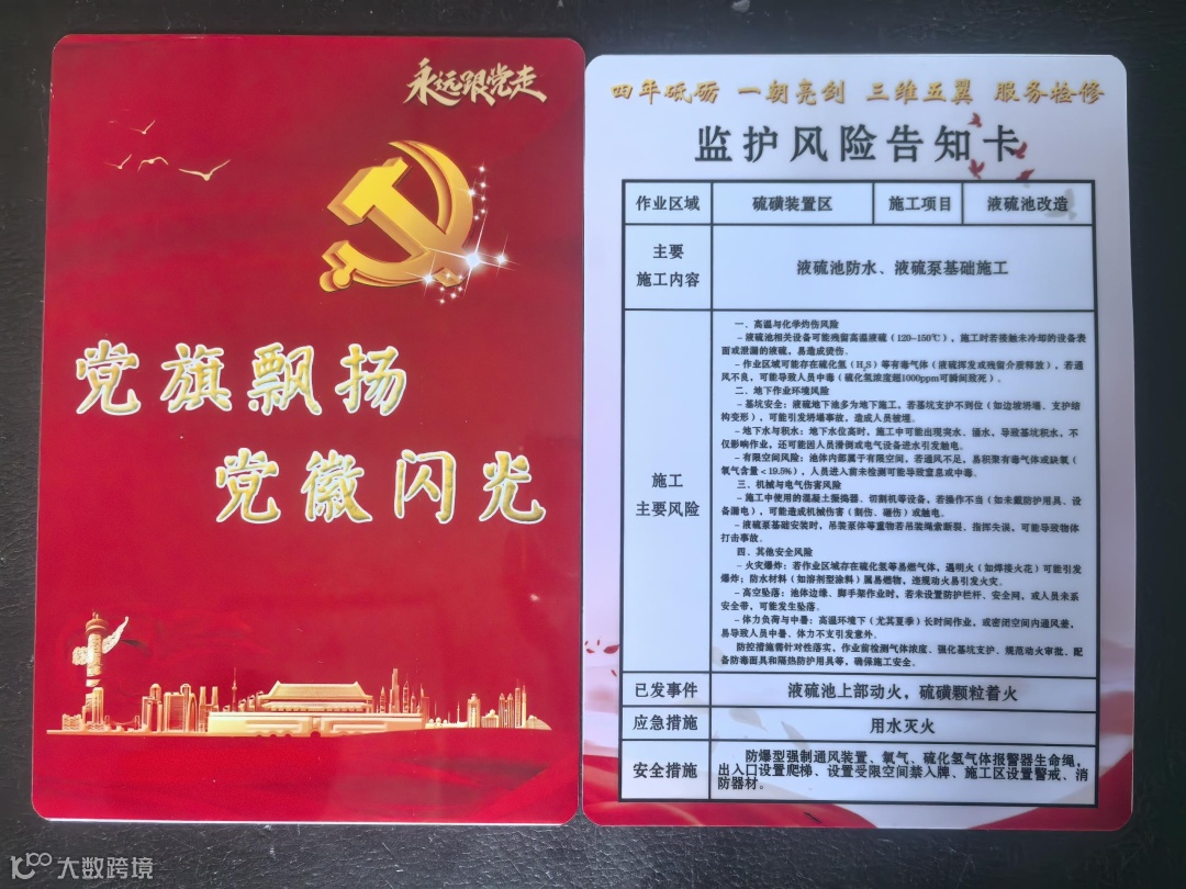 石油二厂硫酸车间党支部依据“党建+1+2+3”工作理念,创新推出现场作业“监护风险告知卡”。卡片详细记录着施工作业点位风险点、易发问题信息、应急处置要素及员工自我安全与健康防护指南等信息。截至目前,40张“监护卡”已送达员工所在工作区域,并设立“问题登记墙”,对监护中出现问题进行集中登记,制定整改措施,完善更新档案,最终闭环管理。“监护卡”上还特别设置了“党员责任区联系人”,支部的党员干部与一线员工结成“安全包保对子”。通过建立监护风险告知卡片,共查摆问题13项,为后续施工现场作业管理提供了精准依据。