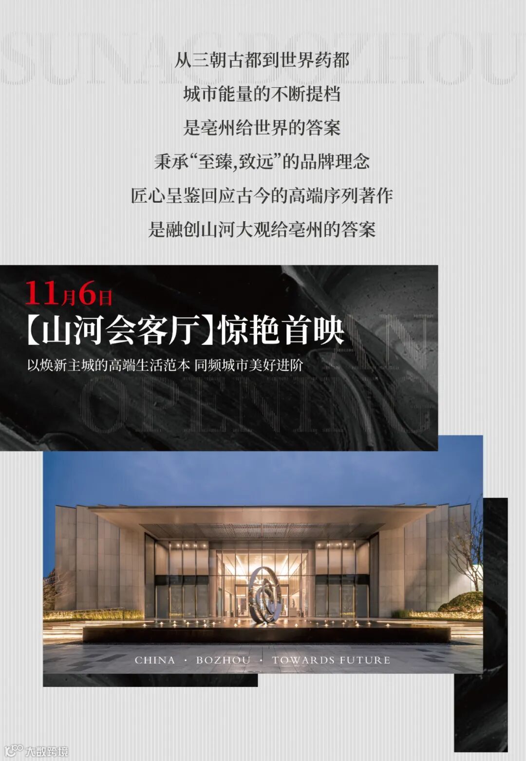 1、本项目推广名为“融创·山河大观”,备案名为“亳源里”,本项目开发公司为:“亳州建投房地产开发有限公司”;建设公司为“阜阳融创新领置业有限公司” ;2、本资料为要约邀请,不作为要约或承诺;买卖双方的权利义务以双方签订的《商品房买卖合同》及其补充协议、附件等书面文件为准;3、本资料为要约邀请,不作为要约或承诺;买卖双方的权利义务以双方签订的《商品房买卖合同》及其补充协议、附件等书面文件为准;4、相关宣传内容不排除因政府相关规划、规定及出卖人分期规划、未能控制等原因发生变化;5、本活动最终举办或取消的权利归活动主办方所有;活动主办方有权对宣传资料进行修改或在法律允许范围内解释,敬请留意最新资料;6、本资料中数据为当日案场来访数据,所发布内容为2021年11月6日前的信息,出卖人将不定期对宣传材料进行修改,敬请留意最新资料。