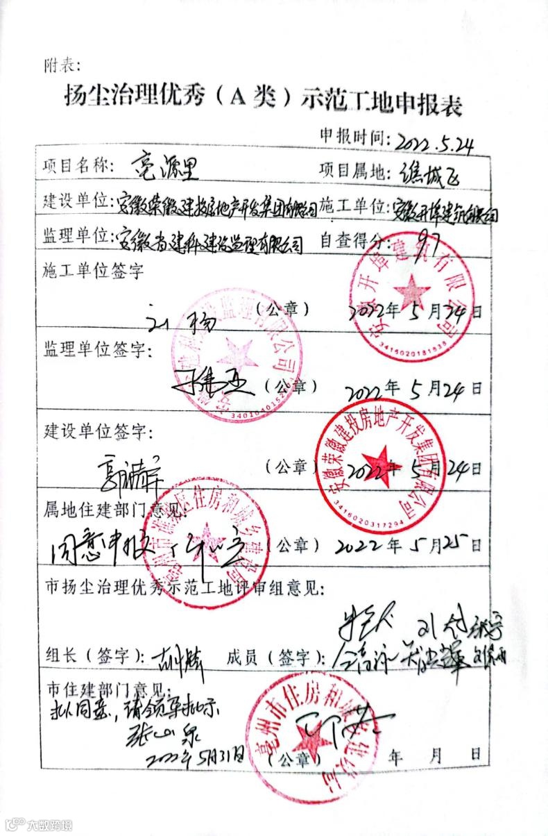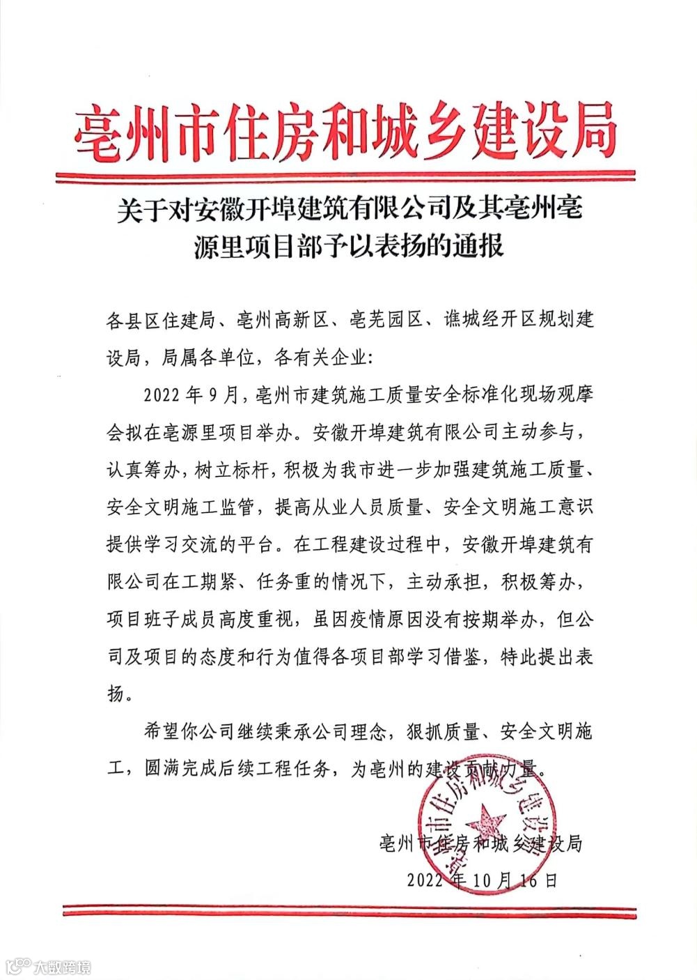 安徽开埠建筑有限公司在工期紧、任务重的情况下,主动承担,积极筹办亳州市建筑施工质量安全标准化现场观摩会,项目班子成员高度重视,特此提出表彰。