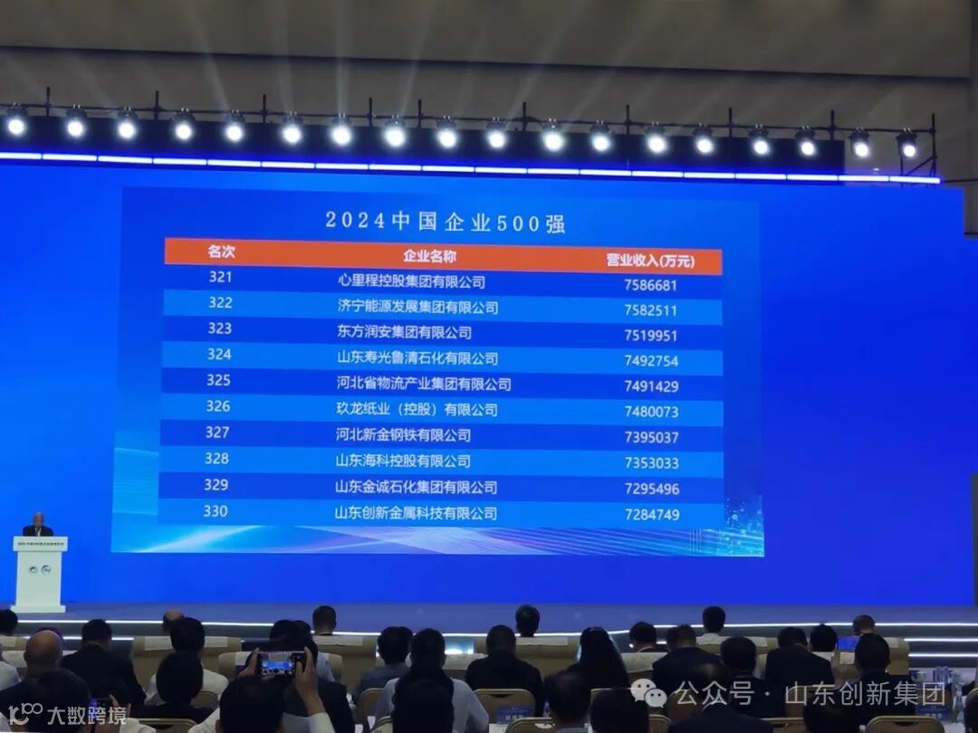 9月11日,在以“向‘新’而行 打造更多世界一流企业”为主题的2024中国500强企业高峰论坛上,中国企业联合会、中国企业家协会发布了2024中国企业500强榜单,山东创新金属科技有限公司位列第330位,比去年上升5个位次,自2017年首次入围至今,已连续8年上榜。