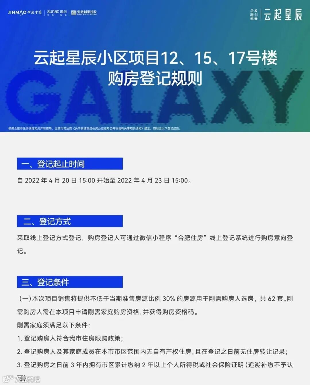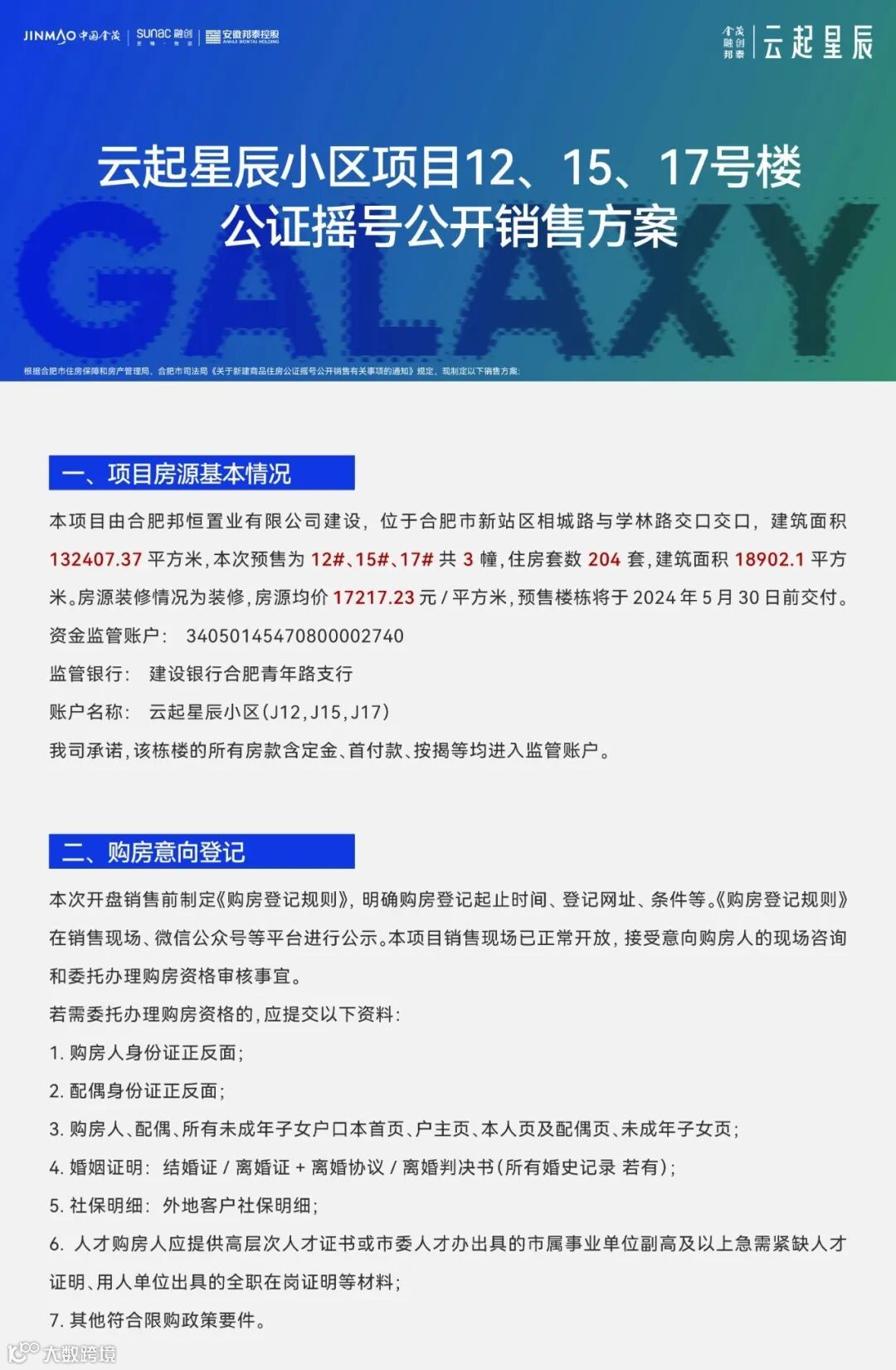 1、项目推广名为“融创邦泰·云起星辰”,地名办核准名/备案名为“云起星辰小区”;开发公司为:“合肥邦恒置业有限公司”;