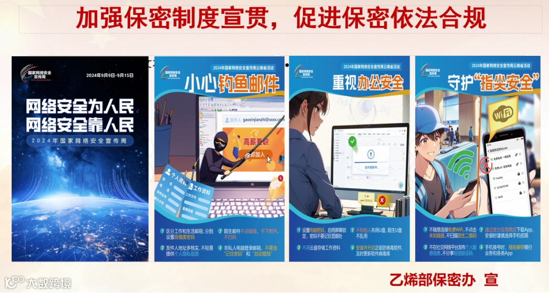 2024年9月9日至15日是保密和网络安全宣传周。为深入贯彻落实公司开展“双周”保密宣传活动的要求,进一步加强保密宣传教育,推动保密宣传教育知识入脑入心,不断提高全员保密意识,筑牢安全防线,乙烯部保密办以“双周”活动为契机,多措并举开展“加强保密制度宣贯,促进保密依法合规”“网络安全为人民,网络安全靠人民”保密宣传教育主题活动。