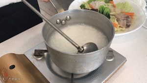 2. 砂锅倒入骨汤,加少量干饭匀开,配姜丝大火煮沸;