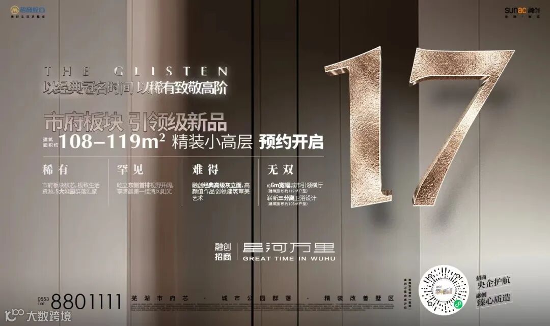,以稀有致敬高阶,五一小长假,芜湖市府红盘融创招商星河万里GLISTEN17#楼正式启动预约。17#楼屹立项目东侧首排,以融创经典高级灰立面创领建筑审美,建筑面积约108/119㎡精装小高层分别以崭新三分离卫浴设计和约6m宽幅横厅展示极致尺度灵感。