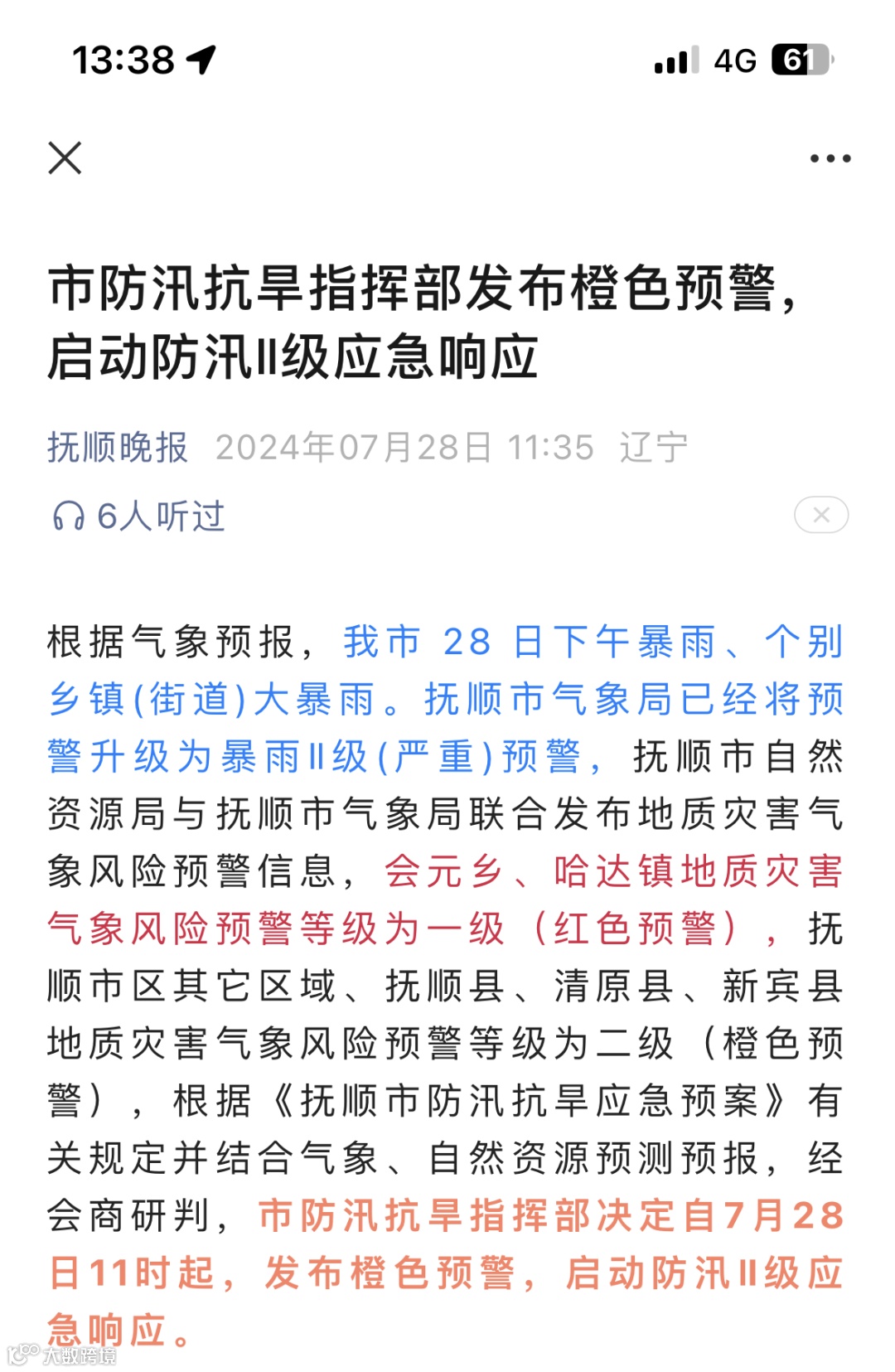 7月28日11时起,市防汛抗旱指挥部决定发布橙色预警,启动防汛II级应急响应。
