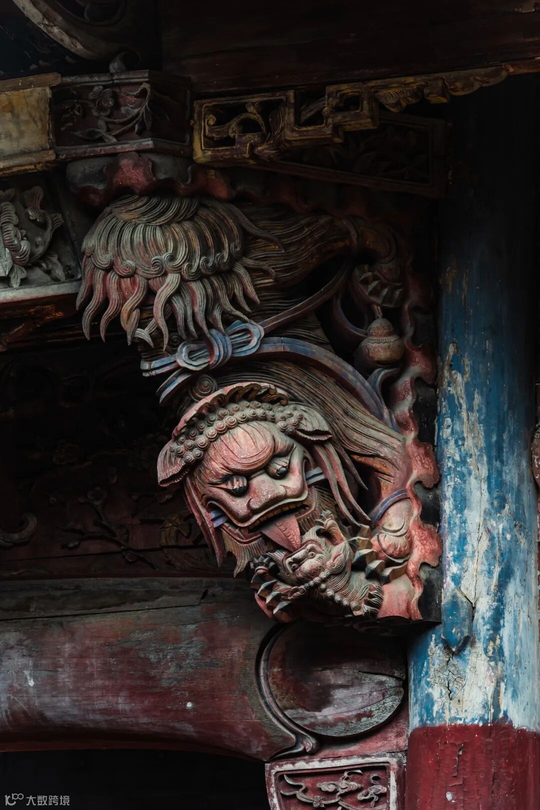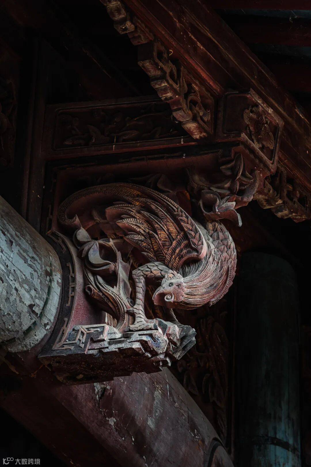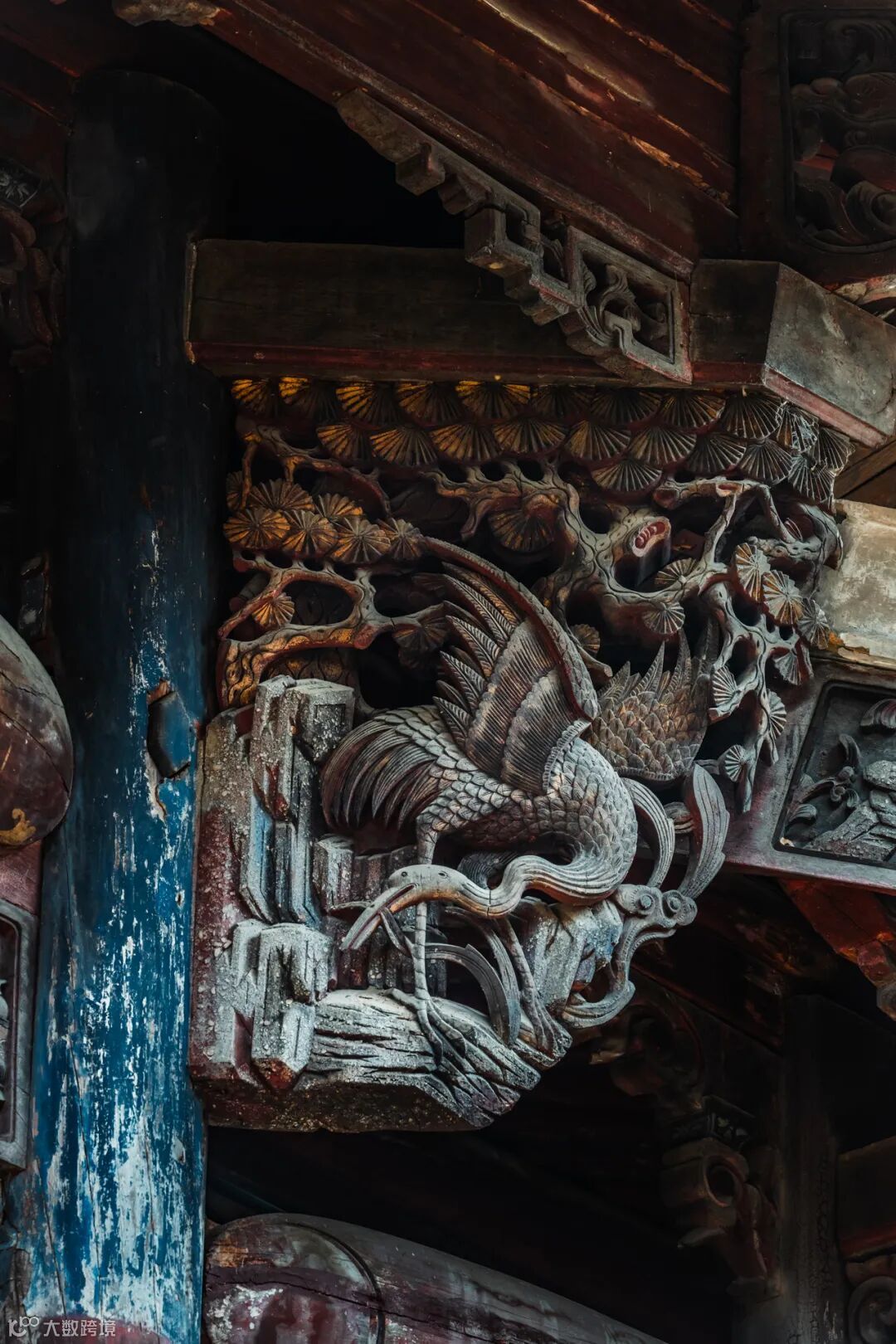 古镇的建筑内以精湛的⽊雕艺术和丰富的彩绘最具特⾊,所有的梁、枋、脊标、天花板,均绘⽉⼭⽔、⼈物故事以及⻰、凤、花、⻦等绘画作品。