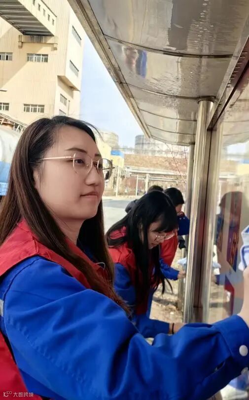在擦拭企业文化宣传栏时,青年们用干抹布细心擦拭,确保宣传内容清晰醒目。经过一个小时的劳动,原本蒙尘的路牌重新焕发光彩,宣传栏面貌焕然一新。