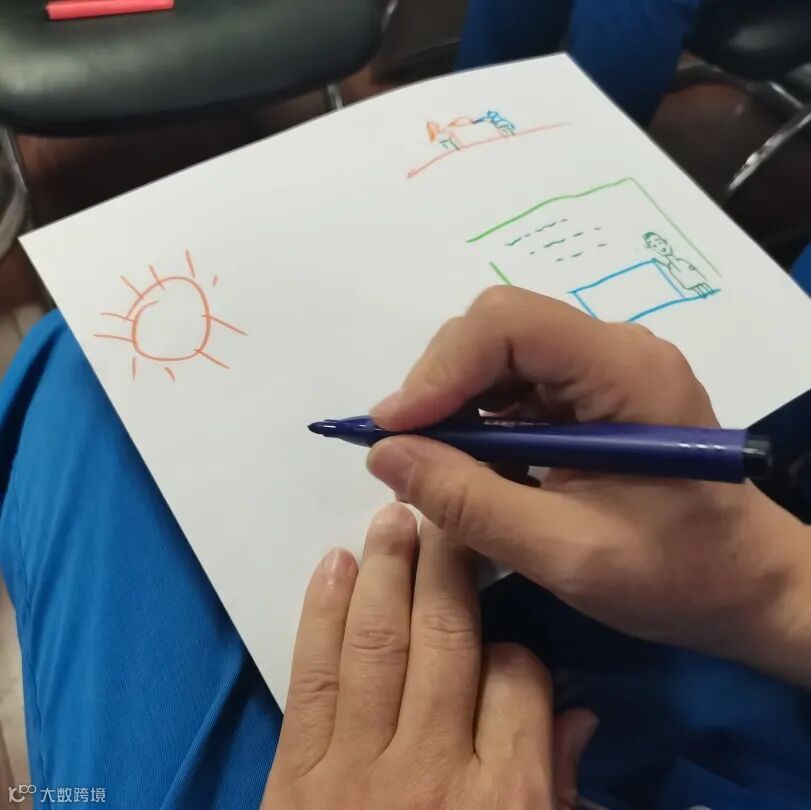 在“美好生活”环节,员工们结合自身的经历和对未来美好生活的向往,绘制出了心中的美好画卷,并在小组内分享了绘画的内容和内心真实的情感。在“浴火重生”环节,员工们两人一组,交换图画,在对方的图画上添涂负面元素。再由图画作者添涂、重建,消除破坏“美好生活”的“困难”和“困境”。