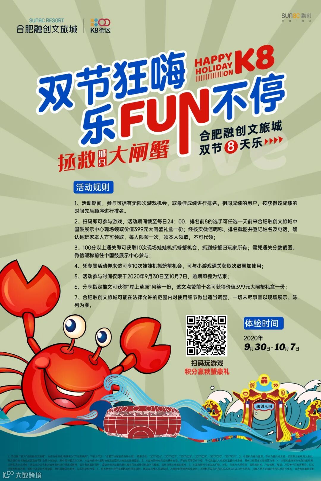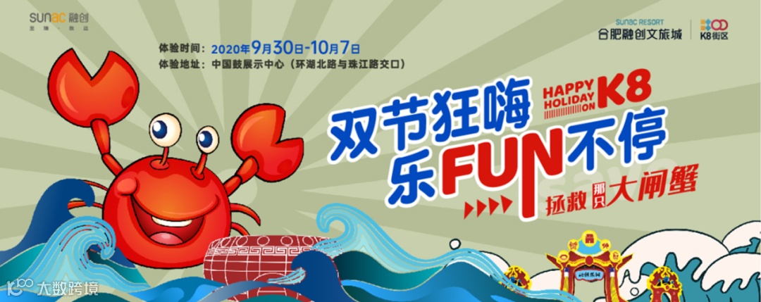 恰逢中秋与国庆相逢,佳节未至礼先行,合肥融创文旅城K8街区“双节狂嗨 乐FUN不停”国庆8天乐,9月30日提前揭幕,盛邀全城一起拯救那只大闸蟹,无限亮点等待探索,撒野狂欢不停歇,给你一个不一样的国庆假期!