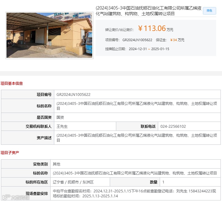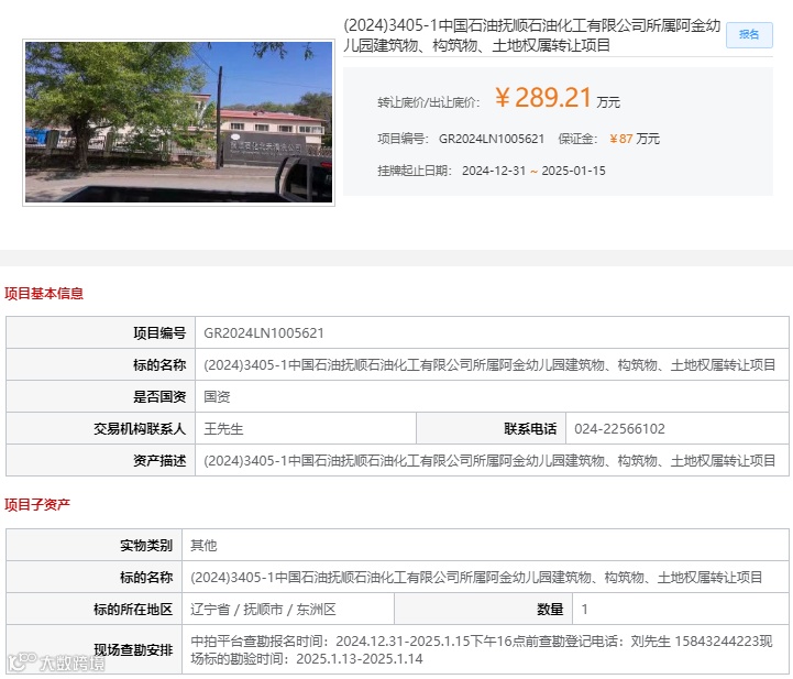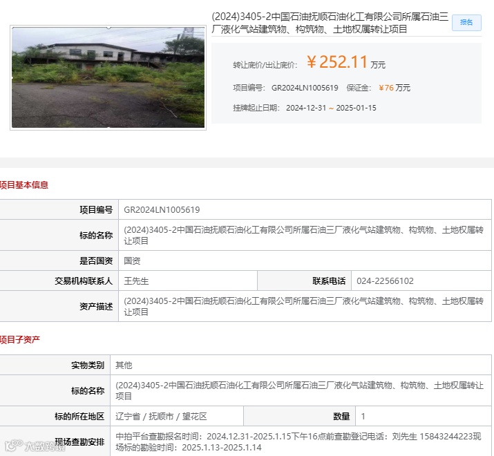 经抚顺石化公司党委会研究决定,集团公司备案批复,抚顺石化公司原阿金幼儿园、乙烯液化气站和三厂液化气站土地使用权及地上建筑物进行处置。目前,已委托吉林化学工业进出口有限公司在中拍平台,以及沈阳联合产权交易所,对这三处闲置房产进行拍卖,本场拍卖会共设3个拍卖标的。