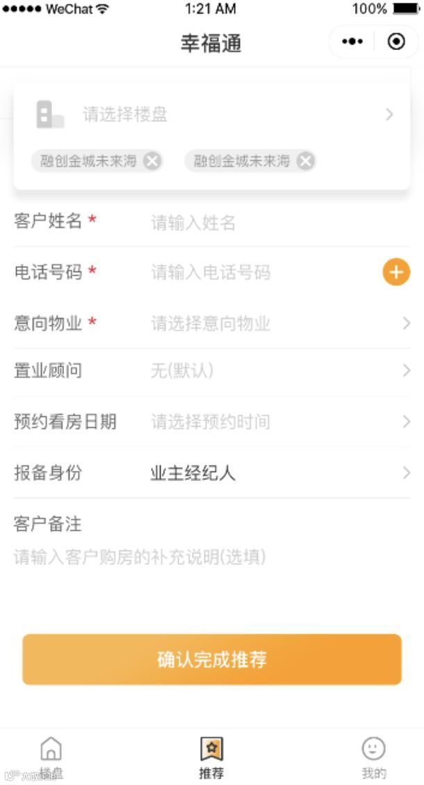 填写“推荐楼盘、“客户姓名”、“电话号码”、“意向物业”四个基础信息必填项,也可预约看房日期,客户备注中补充意向客户的信息,信息越完善,越能帮助置业顾问,为您推荐的客户提供针对性服务。