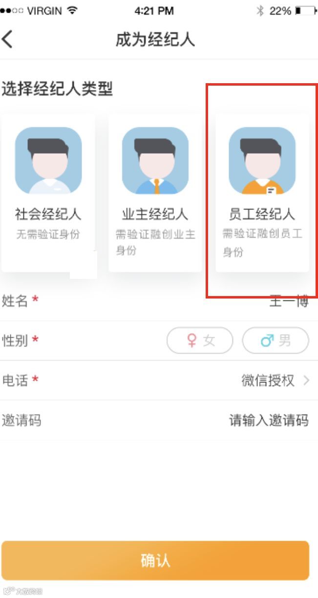 用户在“我的”页面点击“立即成为融创经纪人,选择个人/业主/员工经纪人类型,注册成功后即为经纪人身份。(老业主需身份证号一致,员工需手机号与OA一致)