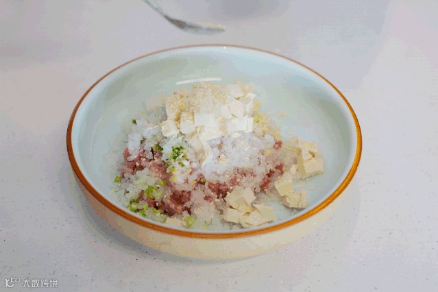 2.置盛器放入肉丁、萝卜丁、老豆腐、寿生酒、食盐、酱油、农家番薯粉等拌匀;