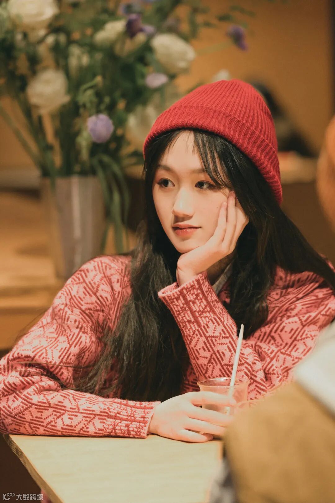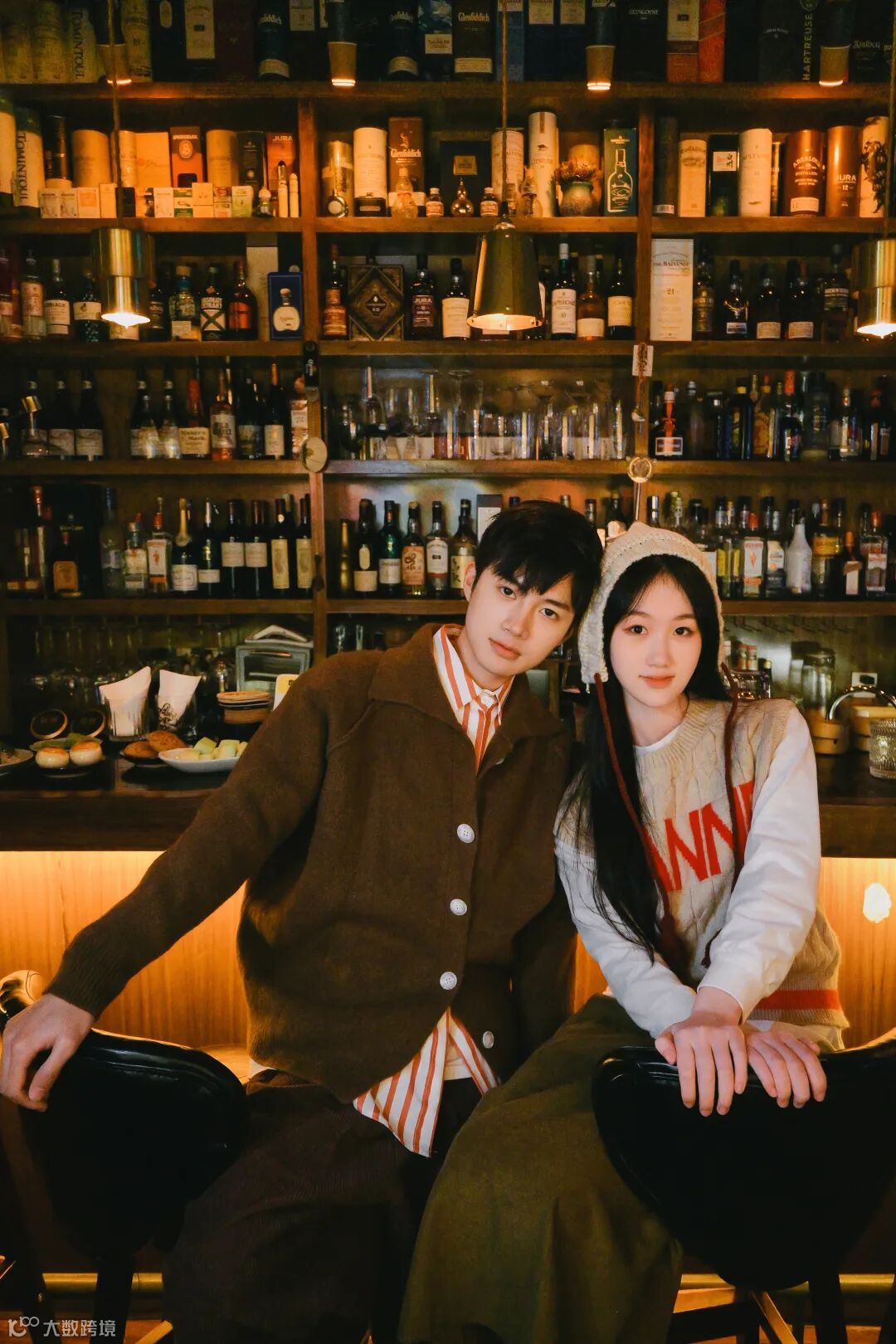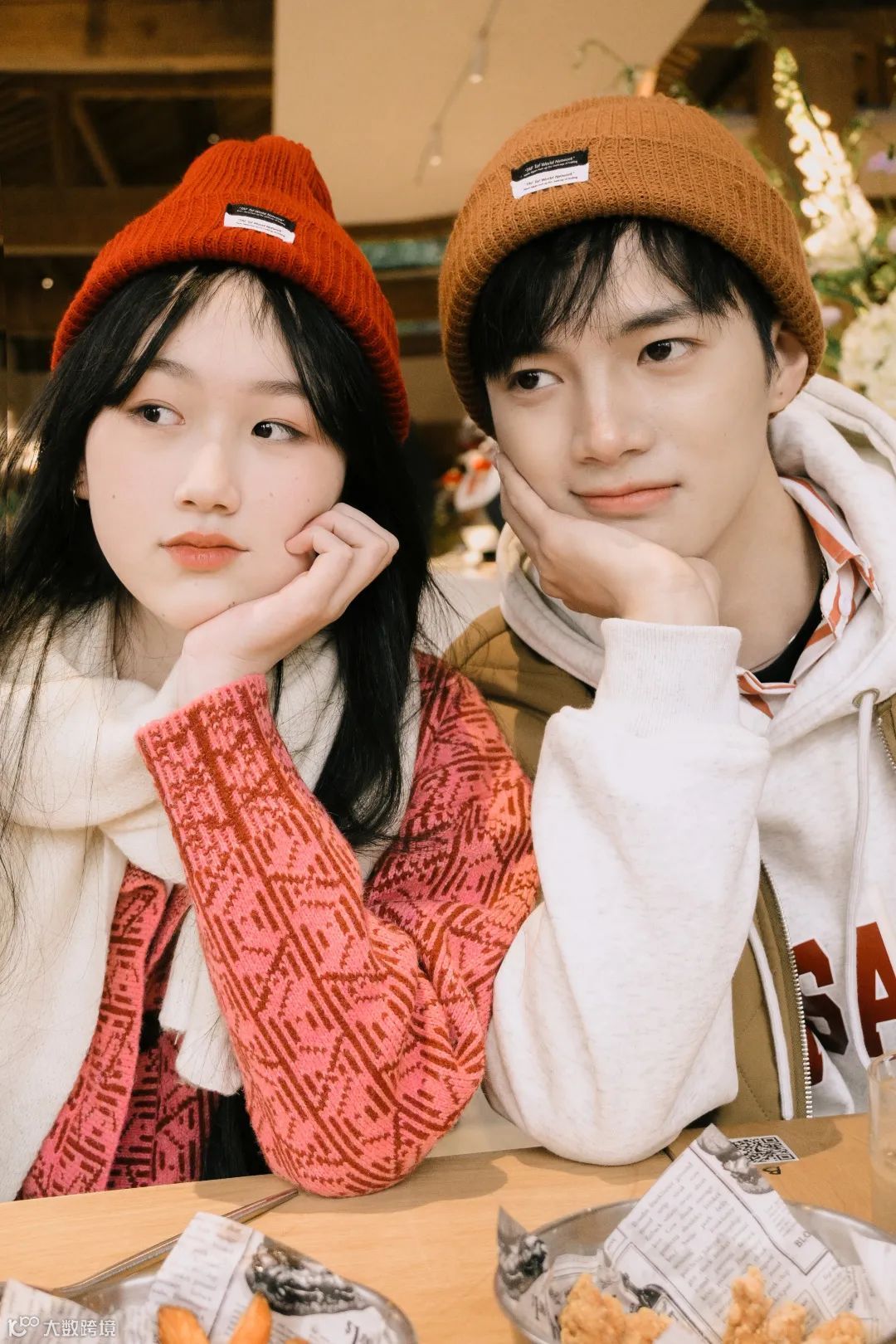 在公共场合拍摄常常会碰到拍摄画面有杂物,或者背后有人的情况,这时可以利用绿植,杯子,纸巾等跟环境和谐的物件靠近相机形成朦胧前景来遮挡,也可以调整相机的高度或人物主体的位置,利用人物本身来大面积遮挡背后的人或物,比如我们可以安排一个人成为另一个人的前景,获得干净画面的同时也能增加趣味性,更有情侣间的代入感。