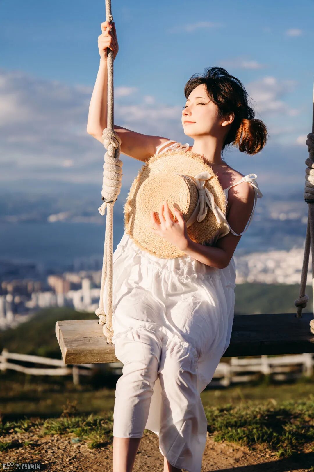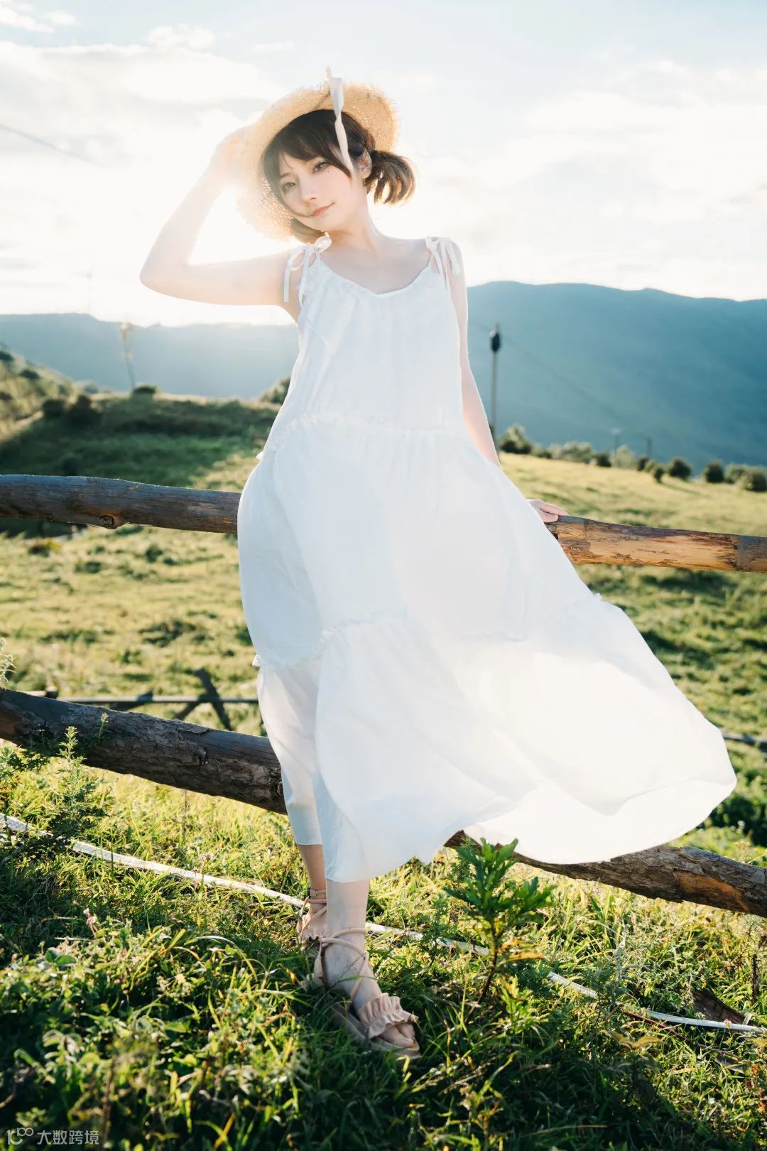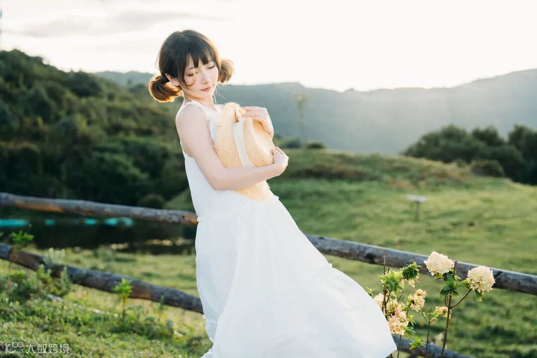这会儿,太阳刚好从云层之中穿过,阳光倾洒而下。我们让模特依靠在栅栏旁,然后放低机位,找一个模特刚好能把太阳遮挡住的正逆光的机位。这样拍摄的话,阳光能把人物勾勒出一道金边,加上裙摆飘动之时的透光的轻盈感,能将整个人物都显得飘然似仙。这时,我们将焦段拧至34mm,用这个接近人眼视角的焦段,恰好能很完美的将湛蓝的天、翠绿的草原,以及中心的人物,都容纳进画面之中。