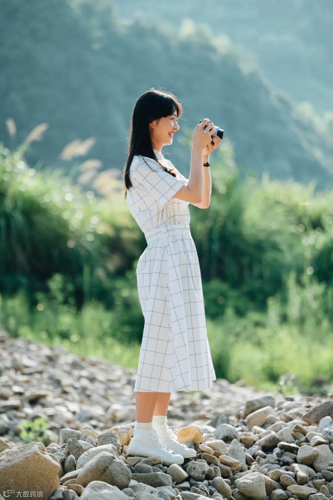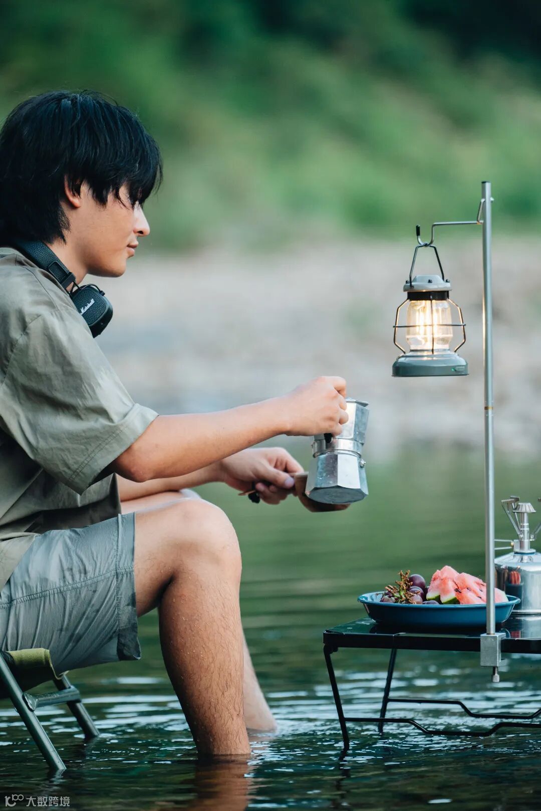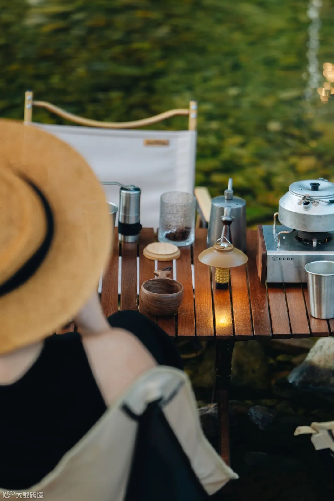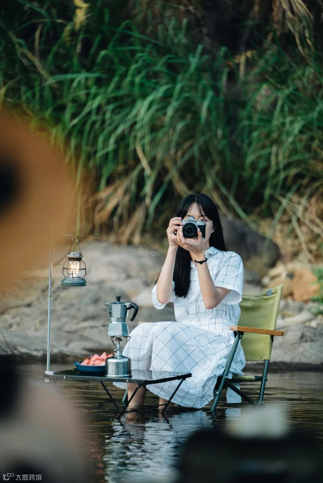 其次,在水边拍摄时,我为模特准备了一身清爽的白色长裙,在自然环境中非常“上镜”。为了契合户外风的主题,还要准备一些能够体现户外风格的道具,例如水壶、露营灯、咖啡壶等,当然也少不了水果和饮品等露营必不可少的元素。