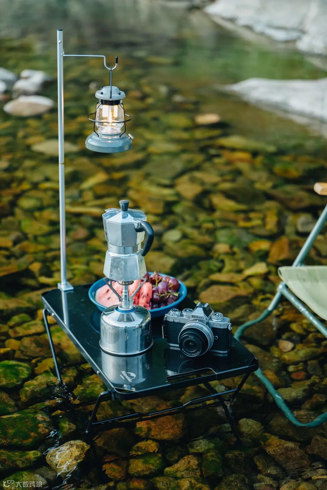 首先,我们要选择一块适合拍摄户外露营照片的场地。这次,我选择的是一处水流平缓的溪流旁,我把露营用的桌椅架在浅浅的溪水里,让场景更加清凉畅快。溪水两畔的鹅卵石和茂密的树林与山脉,形成了充满野外感觉的自然户外风背景。