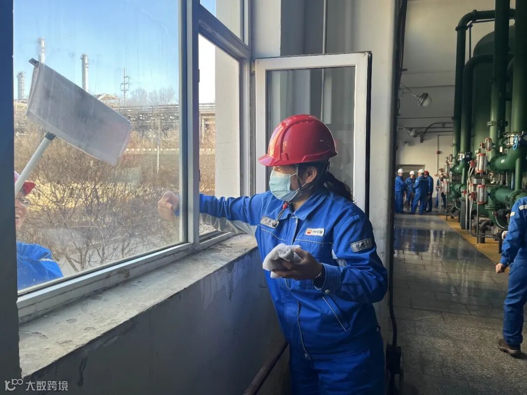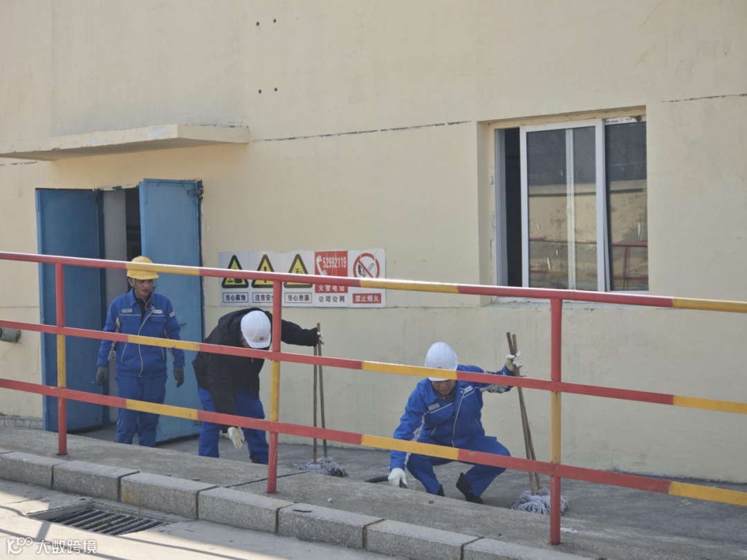 员工们认真将管线上沉积的泥浆和灰尘擦除