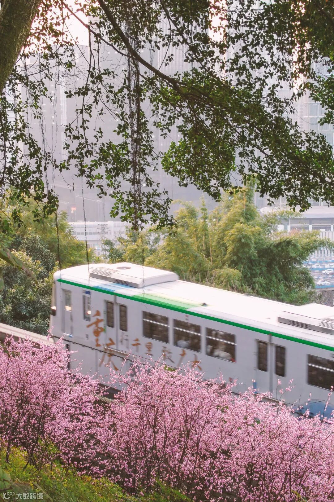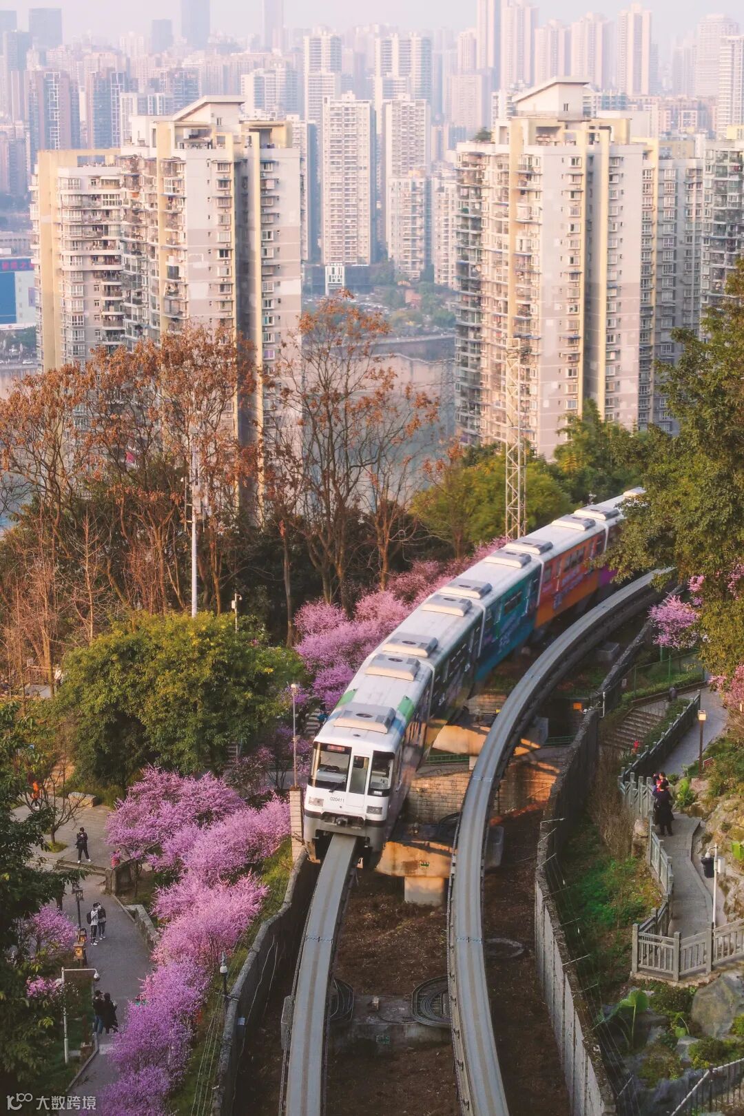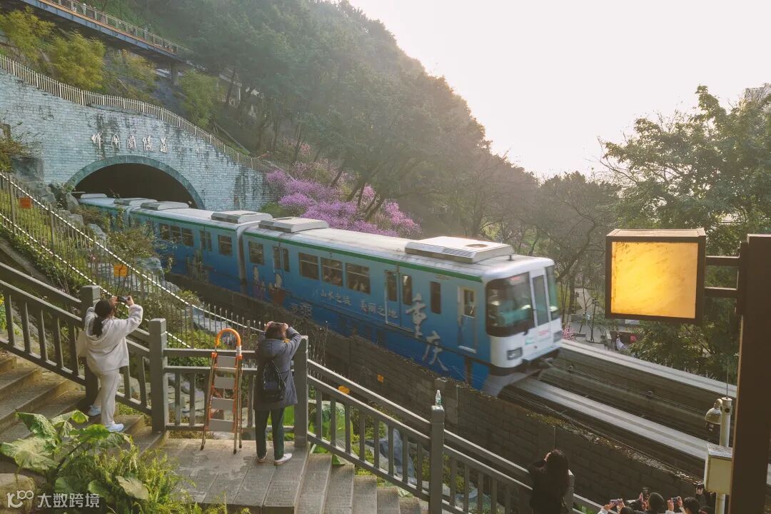 拍摄地点就在重庆佛图关公园,轻轨二号线的佛图关隧道出口一侧。半山腰中行驶的列车,刚好遇见满山坡盛开的美人梅,吸引了众多市民围观拍照,但拍摄还是很有技巧性的。譬如下图,很多人想要拍摄刚刚出洞的列车,但是没有好看的前景,没有春天的效果。