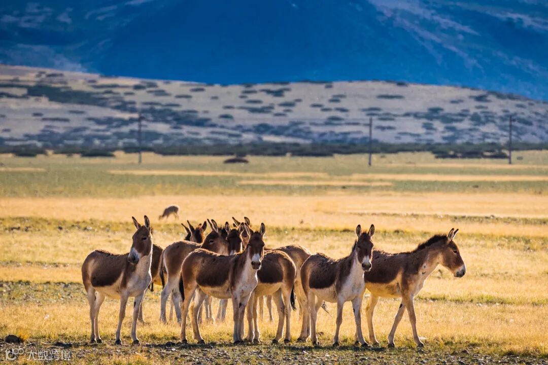 与罕见的藏羚羊相比,我们更多遇到的是藏野驴。它们的听觉、嗅觉、视觉均很灵敏,若发现有人接近或敌害袭击,先是静静地抬头观望,凝视片刻,然后扬蹄疾跑。见到藏野驴的第一时间我就爱上了它们,爱它们驰骋在金色草原上的矫健身姿,爱它们圆润流畅而又棕白分明的身体曲线,爱它们阳光下金光闪闪的鬃发。